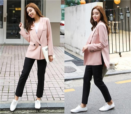 当然,小西装+九分裤的搭配也是十分不错的。小西装采用粉色的颜色设计让女生看起来刚中带柔,修身的中长款版型更是为女性增添了时尚的气息,简约的黑色九分裤修身显腿型,两者搭配起来,简单又有范。