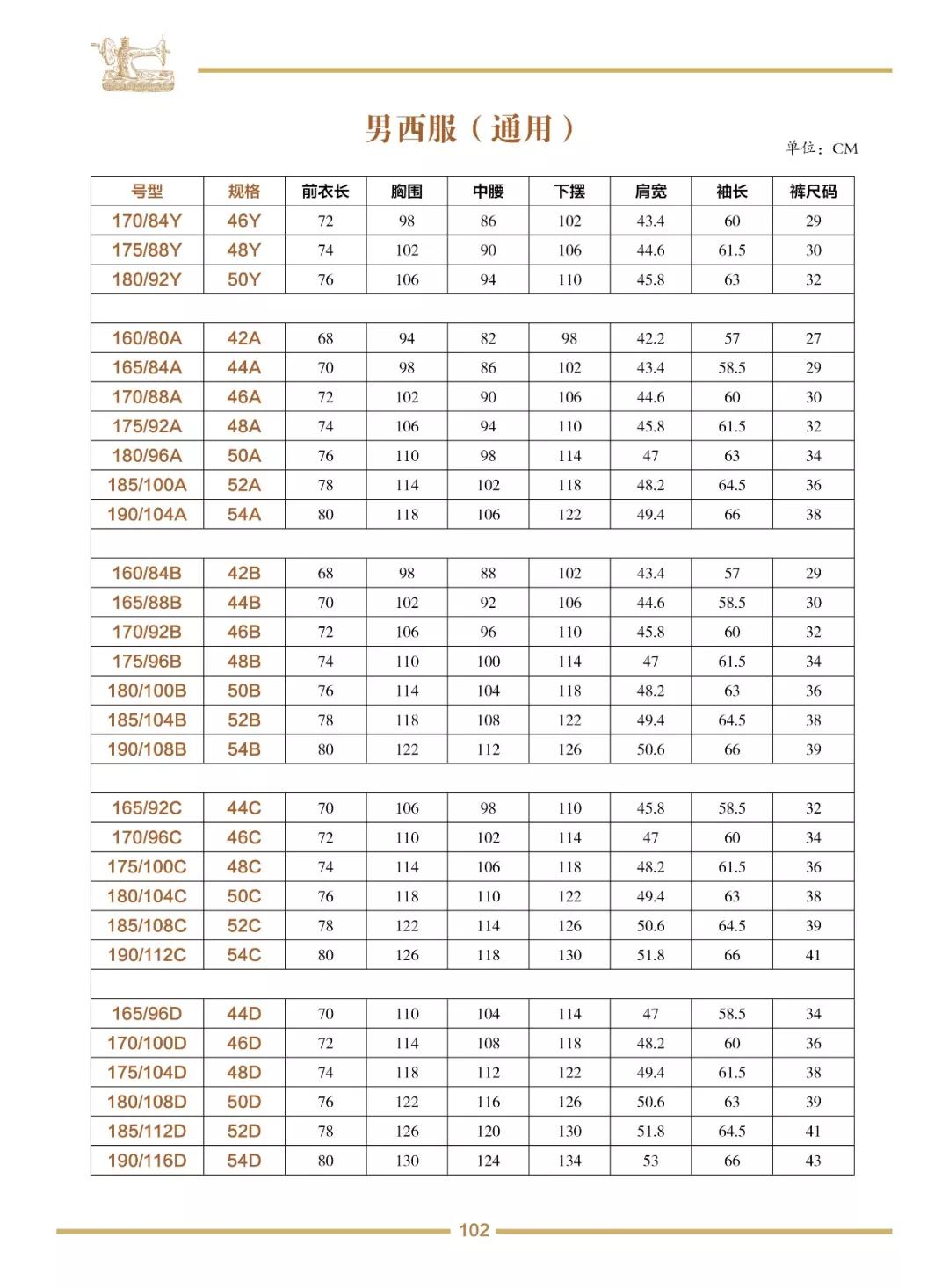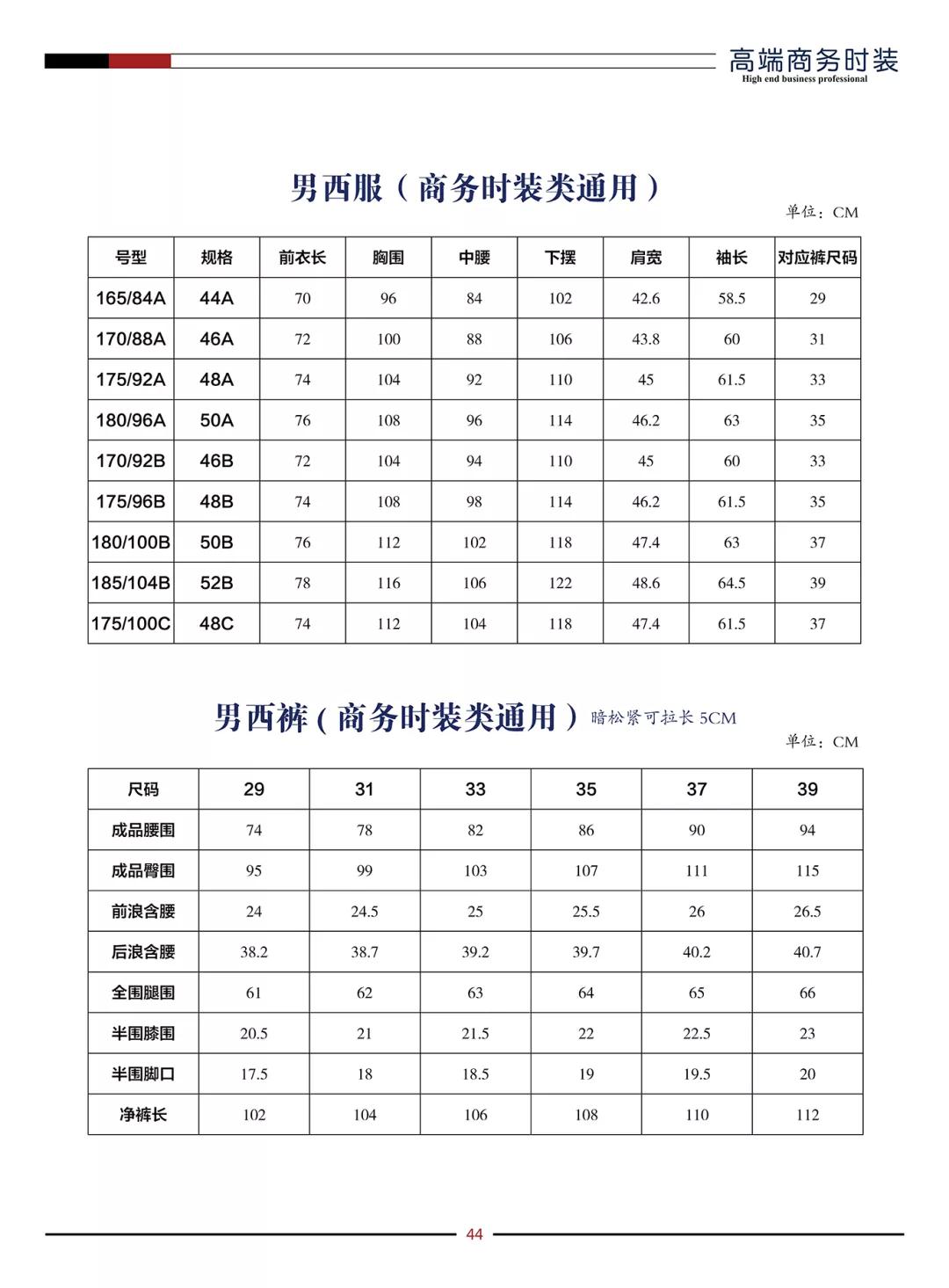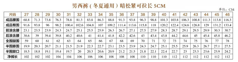 男西服、男西裤尺码表